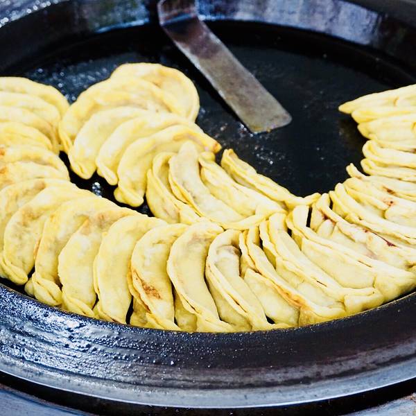 典型的南京老小吃,饭店排队等锅贴出锅的情形实在不少见。金灿灿的锅贴个头很大,外脆内嫩,汁水四溢。记得要辣油。