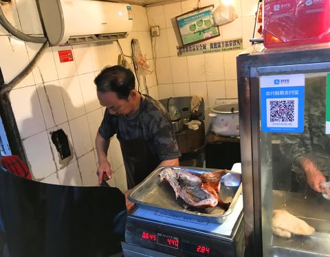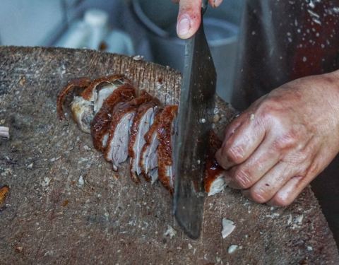 店里儿子剁烧鸭妈妈打包,师傅手起刀落,非常利落