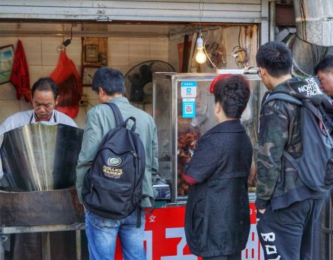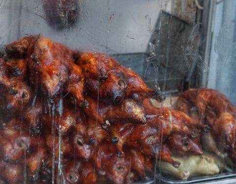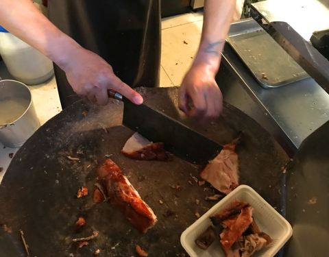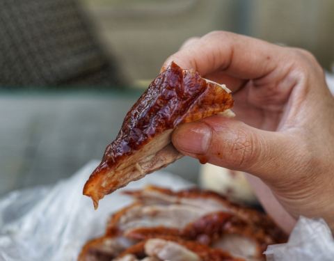 这家店是很多在地人会买的烤鸭,小小一个门面在夫子庙附近。我们赶着早上十点开门过去买,到的时候已经有一小段队伍了。 店里儿子剁烧鸭妈妈打包,师傅手起刀落,非常利落。我和男友买完后立刻跑到对面小区的户外活动中心开吃,皮酥肉嫩,卤汁微微带甜,是点睛之笔。