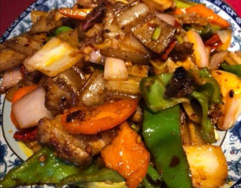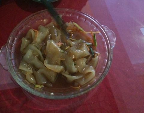 他家的饺子真的挺好吃,很喜欢,吃外皮干爽又不厚,馅料丰满又不噎人,推荐虾仁黄瓜的,又有嚼劲也有颗粒感,虾仁很q弹。拉皮很便宜,口感很好,酸酸甜甜。回锅肉片,口味还行吧。