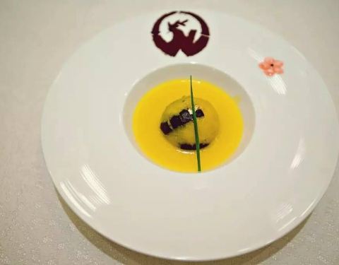 煮透调味后,包入上好官燕,成馒头状,淋上南瓜原汁,配上食用金箔,高端大气隽秀,软糯的口感尤其适合女性