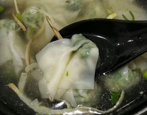 凤爪诚然只有一个,很仔细切成了三小块,倒是方便食用,可以用筷子直接取用就好,不必上手,维持淑女风范。 馄饨是清汤的,看起来有一种清爽感,还有切成丝状的蛋皮,这一碗馄饨也算是比较讲究的了,味道挺不错。吃完也不会口干。