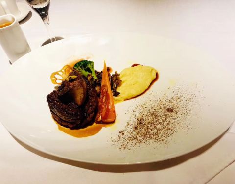 点了双人套餐,八爪鱼沙拉太好吃了,味道鲜美。带子汤,澳洲带子很嫩,汤味浓郁,回味还有些许甜甜的味道。和牛煎的超级香,特别好吃。甜点提苏米拉做的也很不错。