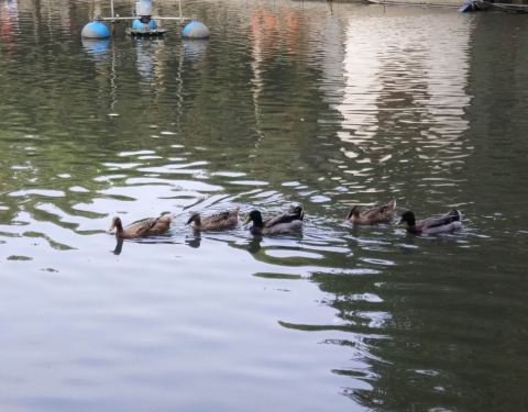 去的时候素食馆人不多,吃的还是那几样,味道还行吧。吃完素斋去放生池兜兜,看到了一群不同的牙鸭子