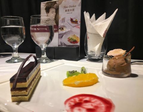 - ...前预定了位置,主菜自然是台塑牛排,这个是统一做全熟的,略微有一点老,量很大,甜品颜值不错也好吃