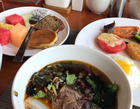 吃的早餐 大厅整洁舒适 食物基本符合五星标准 该有的差不多都有 口感都还可以吧但是面条挺不错的