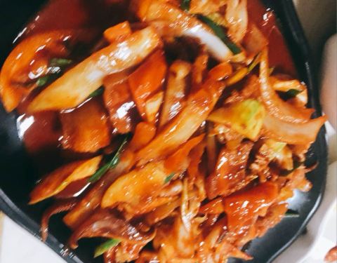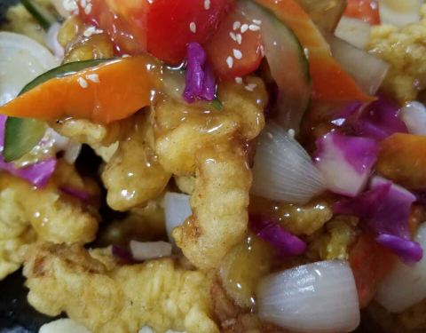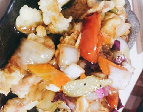 味道还不错的,糖醋糖醋肉也挺好吃,面是绿色的,还蛮特别的呢,味道也还好,价钱不便宜,海鲜不多。不是很实惠。