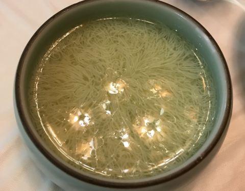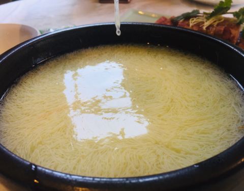 住在瘦西湖边所以到了附近的狮子楼,文思豆腐羹刀功精细味道好,扬州炒饭好吃,极品狮子头很大一个,两个人吃不完。里面装修很漂亮,就是不知道为什么桌椅却是用很普通的桌椅,还包上白布和一次性桌布,档次一下子掉了几级。