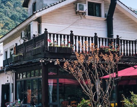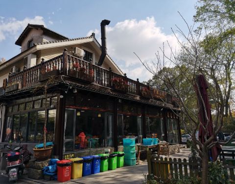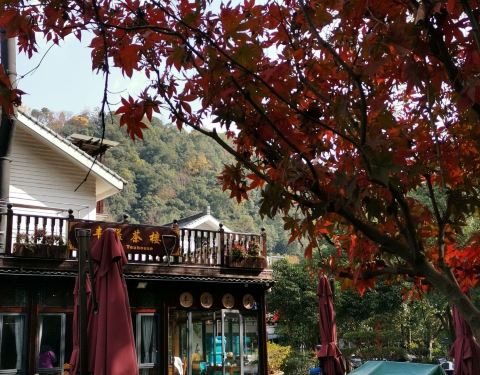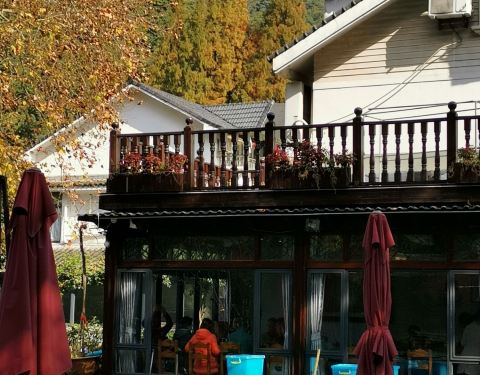 从之江路入口进入九溪,沿着上山的主道徒步往上走,沿途边欣赏风景,边停留拍照。不是双休日,人不是很多,天气很好,暖阳高照,枫叶红了,特别漂亮。 远处是山,近处都是茶园。这家丰溢茶楼是沿途遇到的第一处有...从之江路入口进入九溪,沿着上山的主道徒步往上走,沿途边欣赏风景,边停留拍照。不是双休日,人不是很多,天气很好,暖阳高照,枫叶红了,特别漂亮。 远处是山,近处都是茶园。这家丰溢茶楼是沿途遇到的第一处有集聚房屋的地方,茶楼位置很好,在一个类似三叉路口,左边一条小路进去有很多人家。茶楼门前左侧的空地上有一小块停车处,虽然可供停车位数量不多,但有这个条件已经很不错了。因为九溪路是很窄的,在主道上开车交会车都有点困难,更不用说停车了。所以,停车位基本客满。 茶楼右侧室外也有很多露天茶座,天气好的时候,坐在这里喝茶还是很惬意的。 整个茶楼外观环境很好,因为是第一家,想必生意也不错,看到室内有很多团队客,入座率不低呢。