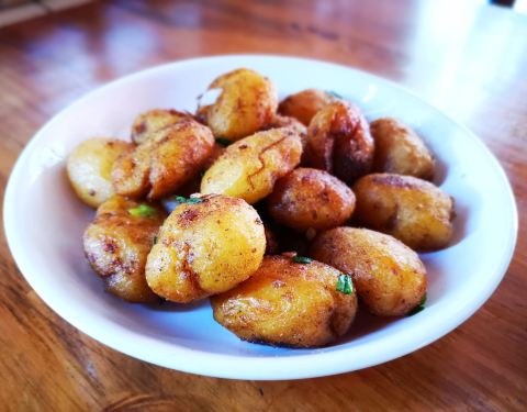 这家丰溢茶楼位于九溪,边上就有很大的一片溪水,很多家长带着孩子在玩水。他家这地理条件算好,周末中午吃饭的人爆满。 |白切鸡^白切鸡上了榜单。做的确实不错。鸡很鲜嫩,蘸点酱油就非常好吃。 |南瓜藤^蒜泥烧的,很清爽。 |椒盐土豆^很香很粉,可以当主食。