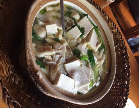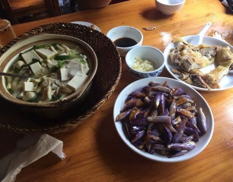 茶楼里品农家乐 吃饱喝足斗地主 九溪十八涧一路上的就餐选择并不富余,这家既是茶楼也是农家乐,上菜速度很快,服务员手脚麻利,迅雷不及掩耳之势就摆满一桌,小伙伴们还在沉迷打牌欲罢不能,服务员就已经三催四请,督促我们赶紧上桌吃饭。小米糕虽然有点凉了不过入口依然香糯,喜欢青菜菌菇汤里的千页豆腐,还有糖醋排骨剁椒鱼头等家常菜,吃饱喝足嘎嘎珊瑚真是心满意足