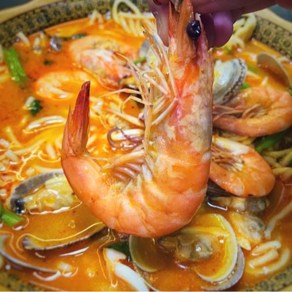 #厦门沙茶面# 吃菜喝酒后来碗面,浓郁的沙茶香,爽滑的碱面,一点不含糊的配料有虾、鱿鱼、花蛤;
