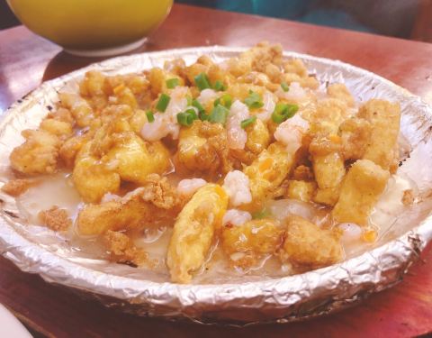 隐藏在鹭江宾馆后巷的海鲜排档 鑫鸿达位于中山路商圈入口处,海后路26号(鹭江宾馆后方,近东方酒店),门店口处摆放在新鲜海鲜养殖池,海鲜可见。 有两楼,一楼二楼座位多为四至五人桌,各有个大圆桌,可容纳12人左右。 招牌香锅煎蟹,螃蟹肥美,有膏,加了黄姜去腥,肉质厚实,新鲜。 招牌食神蛋豆腐,煎豆腐裹上鸡蛋液,切碎加上碎虾仁,配饭好吃。 杂鱼酱油水,常吃大排档必点的一道菜,很具有闽南特色。 烧肉粽,加了花生,板栗,红烧肉等,还挺好吃的。