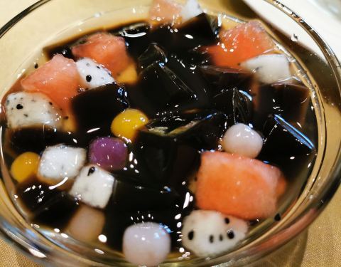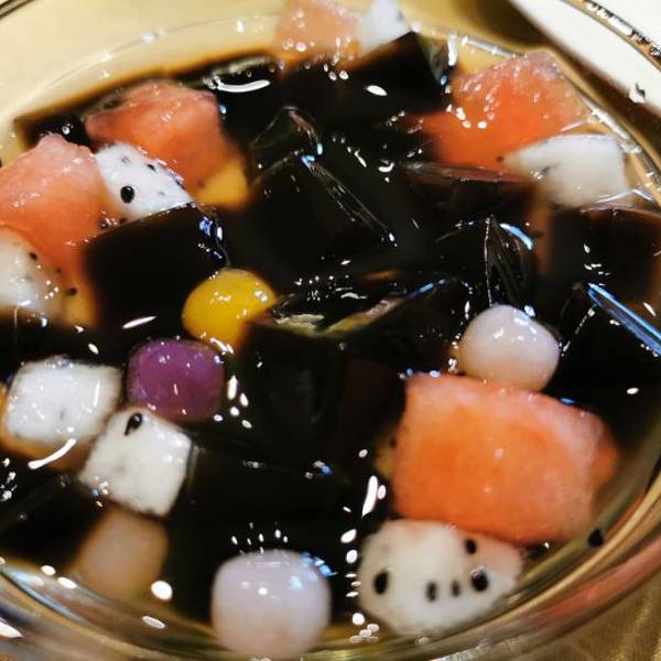 最爱的莫属饭后甜点了~烧仙草是赠送的,有仙草冻 西瓜 小颗的芋圆 加上酸酸的火龙果整体不会太甜!很清爽~养颜桃胶加决明子也是不太甜,超喜欢!