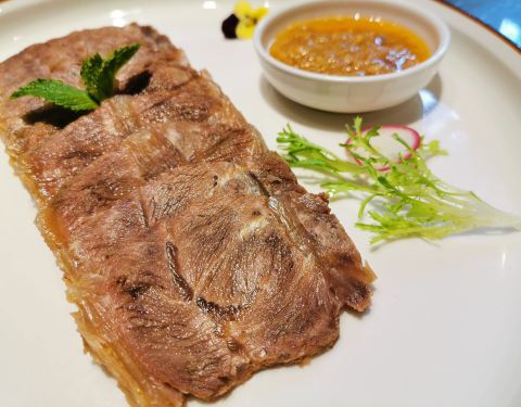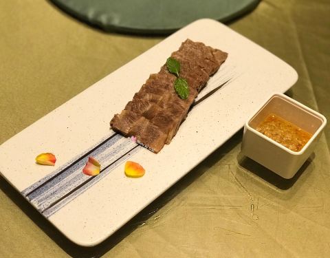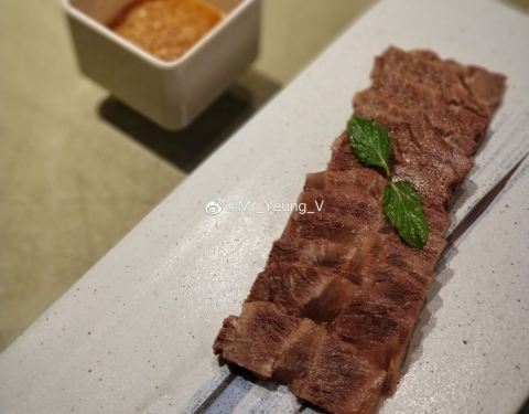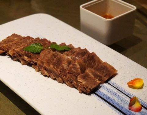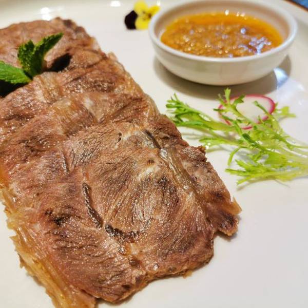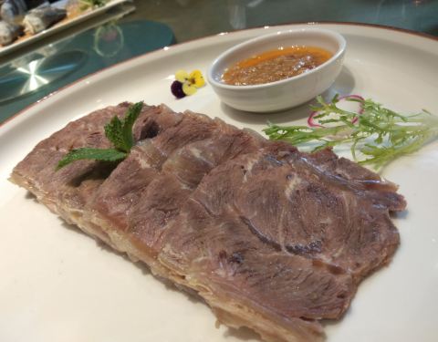 - 超级好吃! 「白切牛肉」用的部位是牛上脑(肩颈脊骨两侧的牛肉)必蘸秘制普宁酱,口感绵软,入口即化