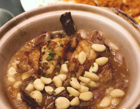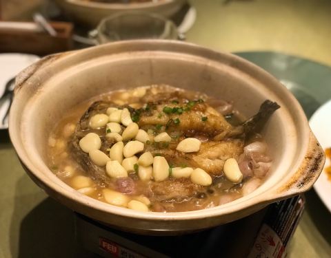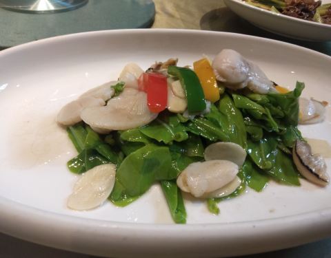 从小上下学到长大上下班经过了无数次却不知道隐藏在其中的黑珍珠~ 【凉菜】 |原味绿笋^就一个感觉,笋很嫩! |白切雪花牛肉^牛肉很有筋道又不会说咬不动,带着筋,搭配特制的蘸酱很好吃 【热菜】 |斑节虾蔬菜沙拉^胡麻酱的沙拉永远是我的最爱!点睛之笔是竟然带有点芥末酱!最近的我狂爱芥末!斑节虾也很贴心的都剥好了~还有各种蔬菜水果 |藤椒鲨鱼^看起来火辣辣的其实不会很辣,藤椒的麻味比较重!鱼肉很嫩很香~ |苦瓜三层肉煲^第一次吃这种做法的苦瓜,和三层肉一起煲,苦瓜软烂软烂的,不是那种讨厌的苦,不喜欢吃苦瓜的我觉得都会爱上~ |猪脚焖大连鲍^鲍鱼和猪脚的结合,这道菜适合加一碗白米饭,非常下饭!鲍鱼的纹路处理得有点美丽 |蛋饺煮丝瓜煲^很适合夏天的一道菜了~汤汁都可以直接喝的那种,咸甜咸甜的 还有一些蔬菜类的看着就很清新很有食欲,整体菜色都很适合夏天! |猪油捞饭^小小一个可可爱爱,比起炒饭更加深得我心!米饭颗粒分明,又有猪油的香气,吃完一碗不是问题! 【饭后甜点】 最爱的莫属饭后甜点了~烧仙草是赠送的,有仙草冻 西瓜 小颗的芋圆 加上酸酸的火龙果整体不会太甜!很清爽~养颜桃胶加决明子也是不太甜,超喜欢!