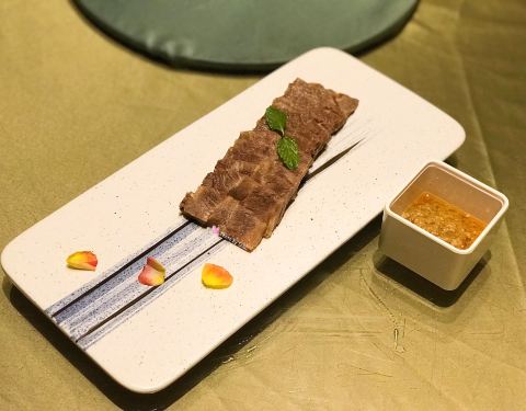 |白切雪花牛肉^牛肉很有筋道又不会说咬不动,带着筋,搭配特制的蘸酱很好吃