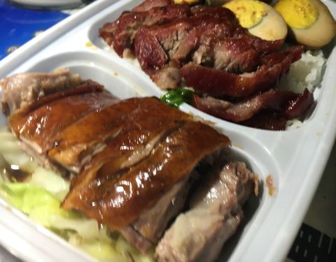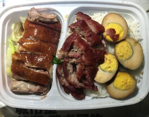 点的外卖,原价42,外加2个卤蛋用了满减券实付29不算贵 外卖销量超级高,不知道是不是真的,甩同行几十条街,但是点评并不多 下单到送到半小时之内吧,挺快速的,拿到手饭还是热的 打开觉得量还不错,不知道是不是因为选的原价比较高的关系 烧鹅配的酸梅酱挺好吃,烧鹅皮是脆的,肉也不会很硬,下面有青菜 叉烧也还不错,一份下肚非常饱,不饿的话都可以2个人吃 就是卤蛋就一般般咯,很小不说没入味,干巴巴