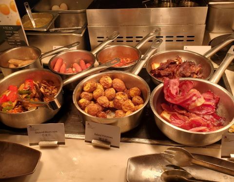 成都东大街明宇豪雅酒店的这家全日早餐厅位置非常好,在酒店的39楼,景观很棒,早餐都是差不多的,味道也还可以,排骨抄手的味道很好。