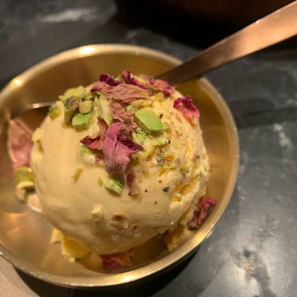 口味算是很清淡的印度菜,所有的味道都不突出,但也并不是不好吃,只是不够出众罢了。 三色烤鸡挺不错的,一次尝到3种味道,配上2种蘸料和柠檬,其实有很多的口味组合。 黄油饼算是印度菜的灵魂,这家的饼还是不错的,要是黄油再多一些会更好。 奶茶非常好,比起有些店甜到死的感觉,这家真的甜度很良心。 送的冰淇淋也挺不错的,芒果味的加一些开心果,也是很好的搭配。