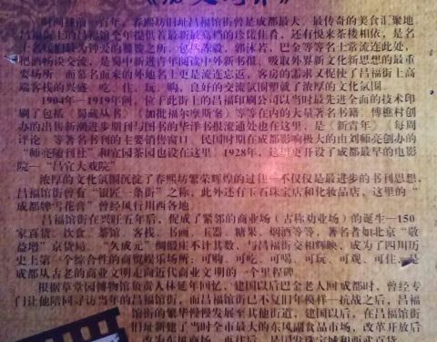 这里百年前的旧址叫“昌福馆”,就是成都最繁华的美食汇聚地,现在恢复原来的样貌,引入了很多当地传统餐饮(老妈兔头、张飞牛肉、赖汤圆等等),是品尝当地美食的好地方。