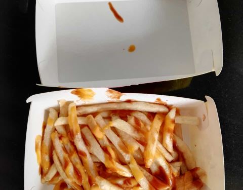 用优惠卷买的,5元一盒,里面直接放的酱料,很酸,没有以前的番茄酱甜,而且薯条是软的不脆,整体感觉一般吧!