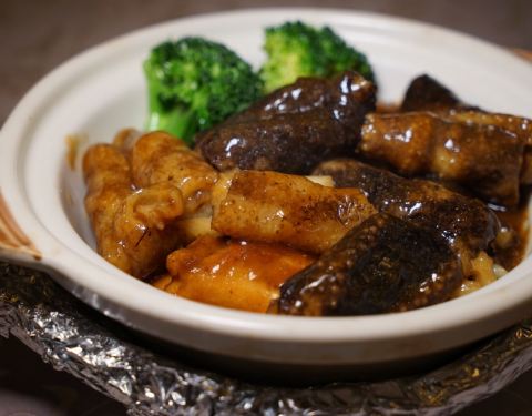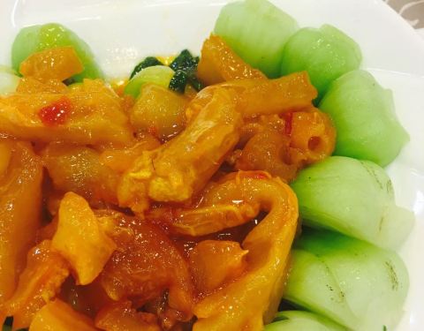 上次试了鹅肠,下面衬底的不是豆角或芽菜,配饭还好,单吃略咸,这次点的豆腐鲈鱼不错,清淡鲜味,好滑;蹄筋趴菜胆蹄筋有些硬、不是炖烂的那种,牙齿不好就不要点囖;干炒牛河降级肉片河价钱一样的,不过感觉比牛河多些肉片和菜心苗,两个人三个菜吃不大完,碟头不小嘎