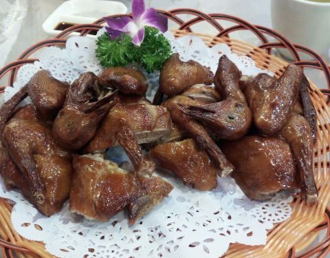 依旧是搜酒店附近一公里范围内的热门粤菜,选择了这里,步行过来用不上10分钟~ 分两个厅,其中一个厅环境好一些,地上是地毯的,然而如果要洗手和上厕所,还是要出门去另外一个厅,餐厅里不弄个洗手间这我也着实不能理解,生意好这些都不用考虑了是吗? 说菜品吧,点了红烧乳鸽,盐焗鸡,类似嗜嗜墨鱼(名字记不住了),还有一个丝瓜浸鱼腐(汤菜)刚好吃完没有浪费 我觉得盐焗鸡味道很好,不过是凉菜,端上来是冰冰的,多少有点吃不惯,感觉至少应该是常温的吧 乳鸽很美味,丝瓜那个菜量挺大,自制的鱼豆腐也挺好吃~ 墨鱼那个不好吃,块大,不入味,腥腥的 服务和环境一般吧,大概是没有收服务费的缘故