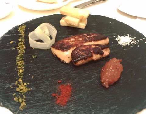 ⛳️位于花园酒店内部的法国餐厅,之前已经在珠江新城的分店吃过一次套餐~ 花园酒店二楼,靠比较角落的地方,门口不算很显眼,里面就比较大。整体风格偏白色,点缀着蓝色的牡丹菊和鲜花,加上灯光较昏暗,反而透出一点神秘的感觉。 每张桌子基本都有一个独立、半开放的空间,空调开得比较大,座位的空间很充足,环境可以说是没得弹了~ ༓༓༓༓༓༓༓༓ 【香煎鹅肝】 作为前菜,香煎鹅肝,分量挺大,两块鹅肝都挺大块,搭配了两种酱料,都是偏清新的口味,可以解鹅肝的腻。鹅肝煎的外焦里嫩,尤其里面基本上是入口即溶,腥味不浓,搭配面包一起吃更好,推荐。 【焗生蚝】 杜邦焗生蚝,分量是六只,生蚝的个头不算大,不过胜在新鲜,入口先是芝士味比较浓,不知道是不是因为有蒜蓉,然后就特别地咸,加上本身生蚝的味道也带点咸,感觉这个真的要重新调味比较好。 【香煎牛排】 厨师精选系列,牛排熟的程度是我比较喜欢,不会太生,加上搭配特调的酱汁,居然有点臭豆腐搭配的那个蒜蓉汁的感觉[哈哈]很特别,也挺香的,牛排的本身中规中矩。 【香煎鳕鱼】 鳕鱼真的很厚,跟我以前那种银鳕鱼不一样,肉质更实一点,感觉比牛排的分量还大,特调的酱汁搭配鳕鱼还不错,就是吃到最后已经觉得很饱同时有点油腻。 这间名仕阁,菜单相当于也是套餐类,当天只提供菜单上的菜式,没有套餐,餐前面包实在不太好吃。晚上基本满座,外国人占一半。但是服务有点跟不上,一条走廊长时间内见不到一个服务员,加水和上菜速度一般般,但是态度还是好的,当然用餐体验还不错。