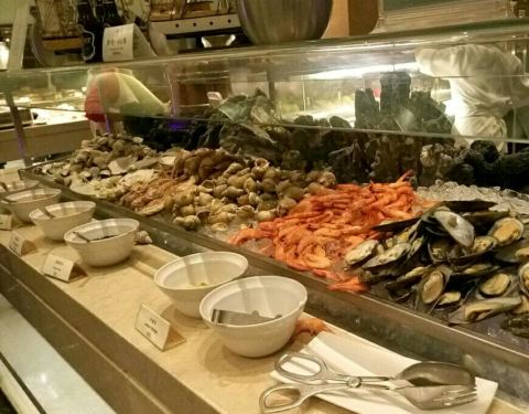 宜客乐餐厅的环境简洁明快,布局紧凑,座椅舒适。这家自助餐品种不算太丰富,但是做得还算精致,性价比还是很高的,而且味道还不错。生蚝,特别是冰镇的,淡淡的海水味,但其实也吃不掉多少。甜品柜在门外,很容易被忽略,其实不乏亮点。水果的品种严重不足。长脚蟹的肉很干,还不如上梭子蟹呢。海鲜供应很足, 三文鱼, 生蚝青口翡翠螺, 很好很新鲜。 手擀面,很筋道,好吃。最爱那个蟹,原本以为肉很少,会空空的,没想到拿回来吃发现挺饱满的,肉质很紧实,应该是新鲜的蟹。东风螺也是我的最爱,第一次吃这么有嚼劲的螺肉。烟熏三文鱼味道也还行,炖汤是黄花菜排骨汤,很鲜美。甜品也是很到位,蛋糕非常好吃。唯一遗憾的就是这里没有随意可拿的饮料。服务员态度很好,几乎有问有答,很有耐心。