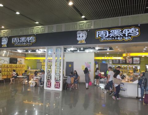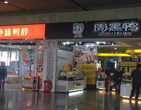 邻近A16检票口,比广州南地铁站的另一家周黑鸭面积大了很多。隔壁是“绝味鸭脖”。有趣的是,周黑鸭店名的黑白冷色和绝味鸭脖的暖色形成鲜明对比,二者都更加突出夺目了。