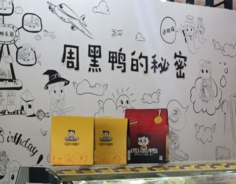 有趣的是,周黑鸭店名的黑白冷色和绝味鸭脖的暖色形成鲜明对比,二者都更加突出夺目了