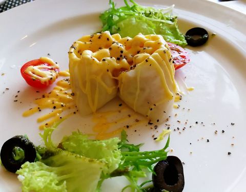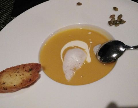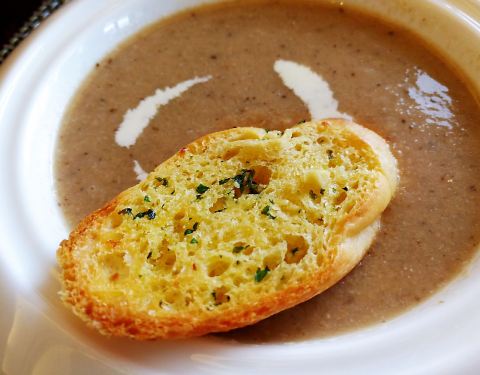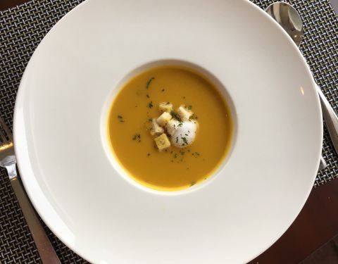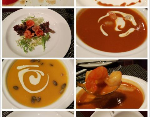 - 汤是蘑菇汤,很浓的蘑菇味,放了一些面包干,增加了脆脆的口感;沙拉的摆盘很精美,用料也很新鲜