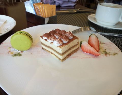 方圆奥克伍德豪景公寓中文有点拗口,英文就很好记,位置也好找,餐厅位于酒店的16楼。 安排了一张窗边的桌子,视野开阔。估计晚餐的感觉应该会更好。 一位女经理亲自为我们提供服务。态度亲切友好,服务妥帖。上菜的顺序和速度准确及时。 安格斯西冷扒品质不错,第一啖外表焦脆,肉质鲜嫩。配菜做得也很好吃,尤其是署茸,够细腻。牛扒份量也很足,提拉米苏蛋糕摆盘靓丽,新鲜味美。卡布奇诺南瓜汤配烟熏三文鱼也可以。餐前面包口味太重了,不是我的菜。 餐厅周菜单,汤+牛扒+甜点/咖啡每位净价138,性价比挺高的,值得体验。