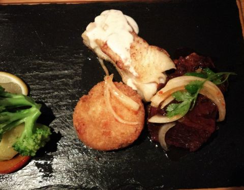 团购E团噶双人海陆套餐,无论环境还是出品甚至服务都很好!比较印象深刻的是煎噶西冷,两面都是脆身的,但里面却是按要求7成熟,赞一个,鳕鱼噶鱼皮都煎得脆脆的。起泡酒的气泡持久,不错。