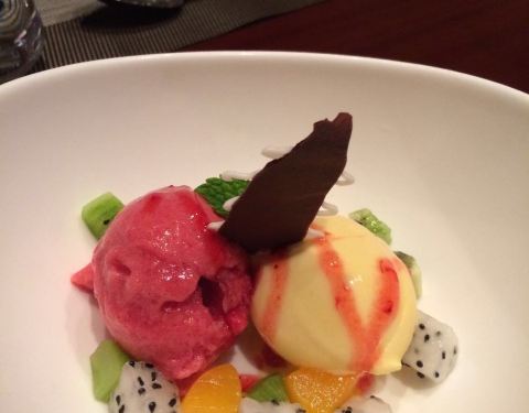 奥膳房的就餐环境装修非常大气舒适、典雅,灯光设计美感,座椅舒适。人不多,安静。食物也还不错,值得一提是一些前菜小食,面包很香,鸭胸肉也不像别家一不小心就容易做得柴,他家做得很柔软,雪芭和咖啡也是很不错的。鸭脯配黄油面包,鸭脯稍咸,但味道不错,面包很有韧性配黄油别有一番风味。但两个不脆的春卷加一点点水果罐头,也算一道菜,稍微差一点。煎鱼嫩滑,就是酱的味道吃不惯。雪葩被换成巧克力朗姆酒味的,感觉还行,中规中矩的。最值得一提的是他们的甜品,芝士蛋糕提拉米苏正得没法说。点的牛排是三成熟,出来的效果口感感觉偏老了一点, 但整体还是很满意的。羊腿感觉蛮不错的, 有点儿骚味但又没有过渡,恰到好处。服务质量相对差一点,但是还算贴心。