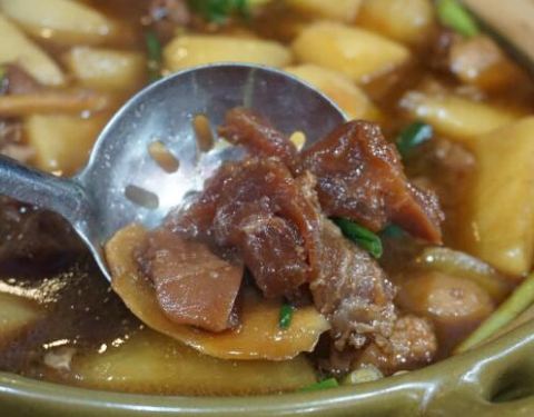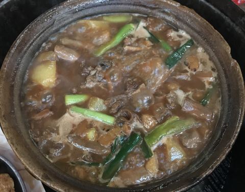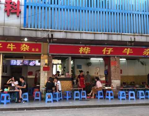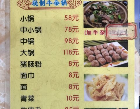 朋友推荐来的,说是这附近比较出名的一家店。大沙地地铁站A出口一出来就可以看到马路对面就是,店里坐得比较拥挤,靠路边摆了一排小桌子,够两个人坐的,桌子间距离很近几乎挨在一起了,典型的大排档环境。 从菜单可以看到店里的出品只有牛杂锅,只是选尺寸而已,两个女生吃个中小锅另加两个配菜足够了。锅里有萝卜非常入味,牛杂还是不错的,首先并不很咸,不像有的地方的牛杂锅咸得难受,其次牛杂有韧劲,带筋的牛肉很好吃,而且牛肠切得很大块也没什么异味。金针菇和面筋放下去煮,入味之后特别好吃。总的来说这家牛杂店的性价比还是挺高的。