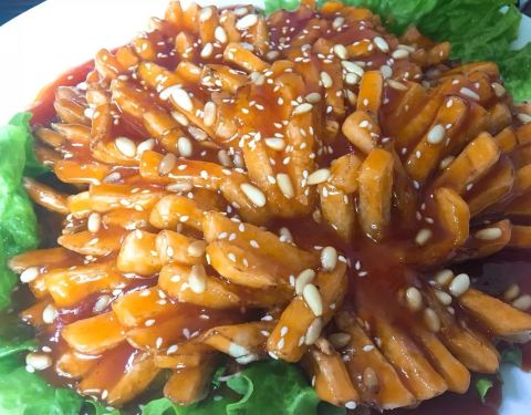 红酒汁焗牛柳,意外的好吃,牛柳的量不少,略带一点甜味儿,酱汁也很浓郁。 菊花茄子,酸甜口的,吃腻了糖醋里脊的,来一个这个菜可以换换口味。 这家价格比较实惠,菜品的味道也很好吃。