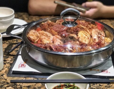 焖锅加涮锅,味道很浓,种类挺多,挺好吃的,吃饭时间长一点,有iPad用