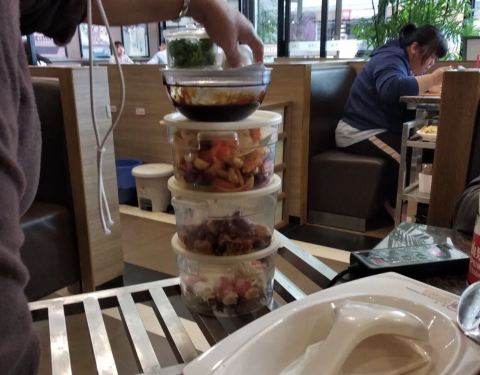 服务员会自己在那操作好久,一锅下来也不算便宜,主要吃酱料吧,喜欢鸡翅,牛蛙,牛肉,泡饼!再下点蔬菜拼盘,还是不错的,他家一般人少不用等位置