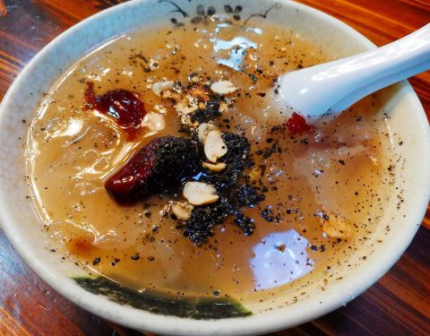 ...这里重点推荐八宝粥,先舀一坨蒸好的糯米,加银耳汤加花生芝麻大枣等,软糯香甜有嚼劲,真是太好吃了