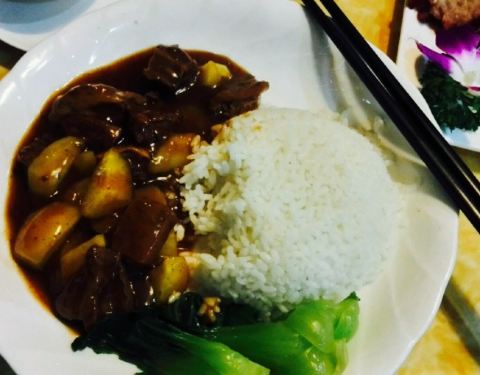 ※ 。冲着红色主题特色去的,彩色贴画气质鲜明,砖墙简朴清丽,红绿桌布喜庆,服务员亦是身着军色服饰。没有见到所谓的表演,一行人便是专心吃饭,耐心掘味。相亲相爱,取了个文艺的名字,实际上就是夫妻肺片,做得不错,香辣爽口,开胃凉菜必点。三样菜,藕,洋芋和花菜的普通组合,这样的叫法不是它家独有,麻辣不出众的菜品咸味就占了上峰,味道一般。土豆柴火鸡,消失已久的柴火鸡惊现江湖,名字是噱头,土豆烧鸡卖相不错,土豆切得娇小,入口刚好,鸡肉出品也很赞,这个菜值得推荐。一品牛肉,一大碗分量惊人,肉多筋少,嚼劲十足。搭配豆腐和红薯,都是我喜欢的素菜,性价比较高,但稍欠特色。※ 。总体说来感觉还行,价格合理,菜品品种丰富,外地朋友品食和家常亲友聚会可选此地。