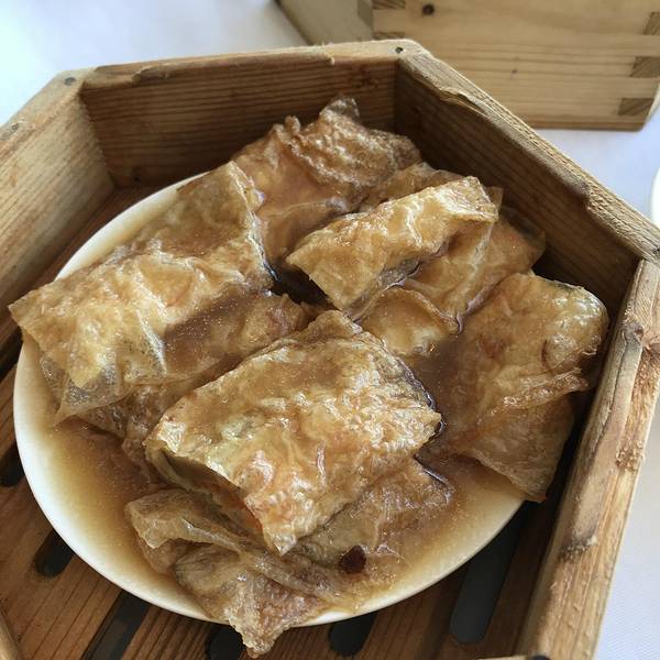 鲍汁鲜虾腐皮卷,一口下去,最先吃到的是浓浓的腐竹味,豆子味很浓,里边有虾仁,香菇还有金针菇,也能尝出鸡肉的存在。杨枝甘露,招牌经典港式甜品,香浓软滑的椰汁混合浓浓的水果香,搭配口感Q爽的西米,美到爆。秘制蒸凤爪,入口即化型,爪比较大个,蒸的很软乎,看起来不怎么完整。连着吃了两个,吃到第二个的时候有点腻。港式秘制叉烧在很多港式餐厅吃的时候大致味道都很像,但是也各有千秋,但在夏宫这个叉烧绝对是够好吃,港味够正,好吃到哭!黑椒牛仔骨,相比烤牛扒和烤羊扒,黑椒牛仔骨则别有一番风味,不仅鲜嫩多汁而且肉味足,那种骨肉易分易离的快感特别让人满足,一边小块吃肉,一边享用几片甜酸水果,一切都毫无油腻违和之感,反倒是恰到好处。金枕榴莲酥,喜欢吃榴莲的人的最爱,外皮酥酥的,放着的时候闻不到榴莲味,一口咬开后榴莲味里面散发出来,得到心里的满足。主菜更是让人拍案称道。荐:烤乳猪,杏仁豆腐拌天鹅酥,家嫂慈菇片皮鸭,金钱盏蟹黄炒虾球等。