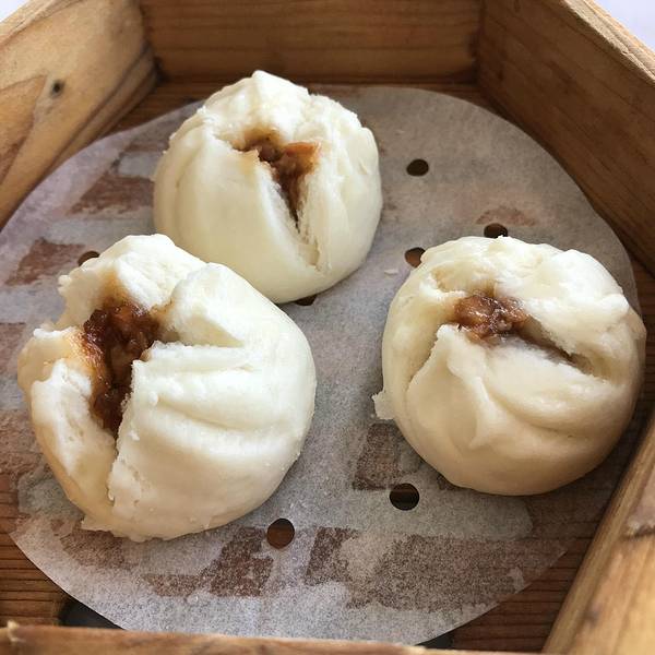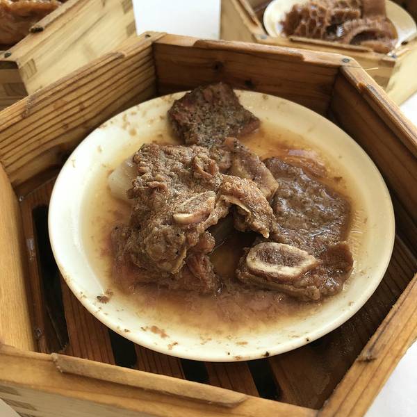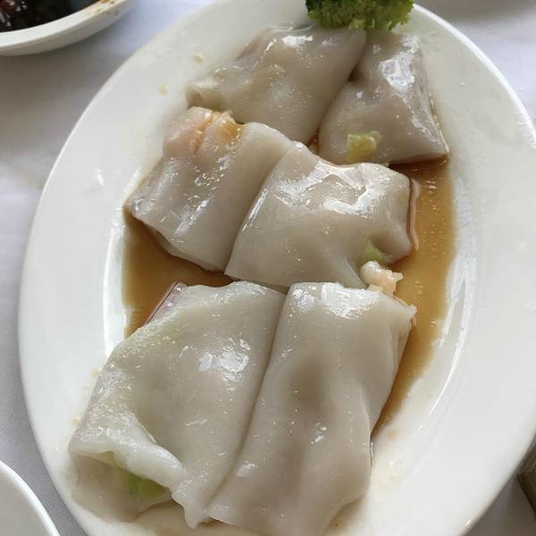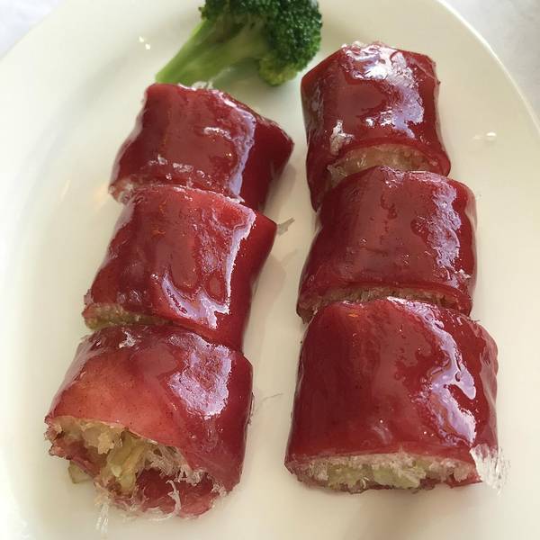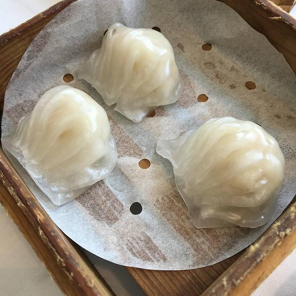 红肠粉,夏宫的红米肠算是港式茶点的招牌,因为我们平常吃到的肠粉是白色的,而红米肠确实红色的外皮,然后还要在肠粉皮里再加入一层越南春卷皮,里面的馅是用虾和韭黄,这样能使口感更多样化,做出来的肠既有广东传统肠粉的嫩滑,也有东南亚的清爽。夏宫虾饺皇,大大的虾仁,一口咬下很满足。鲜虾蒸烧麦皇,小小的一个蒸屉里立着四只饱满圆润的烧麦皇,每个头上都顶着一大颗虾仁。虾仁看起来很粉嫩,虾仁的肉质爽滑、清鲜。一口咬破烧麦,它的皮微黄,吃起来口感筋道。