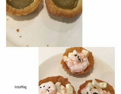 杏仁豆腐拌天鹅酥,杏仁豆腐分两层,下层是杏仁汁加奶和鱼胶粉做成的底,上层是豆腐、芒果汁和薄荷叶,边上搭配的天鹅菠萝包的样子也好可爱哦。