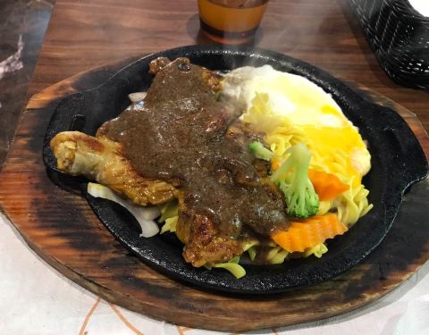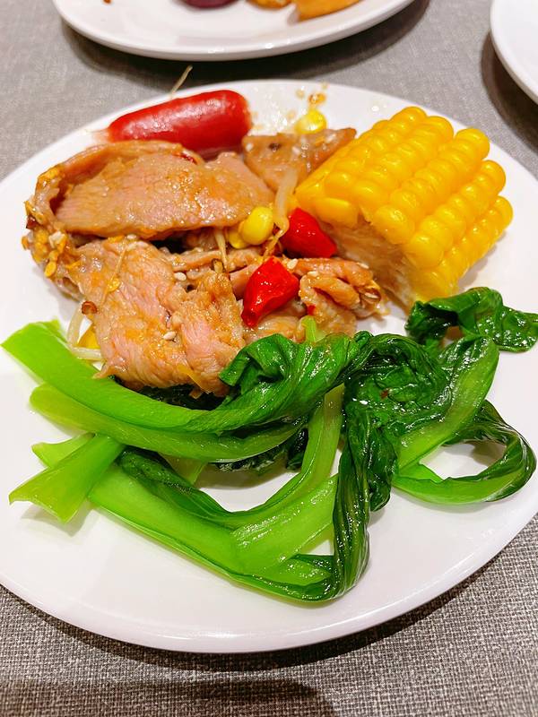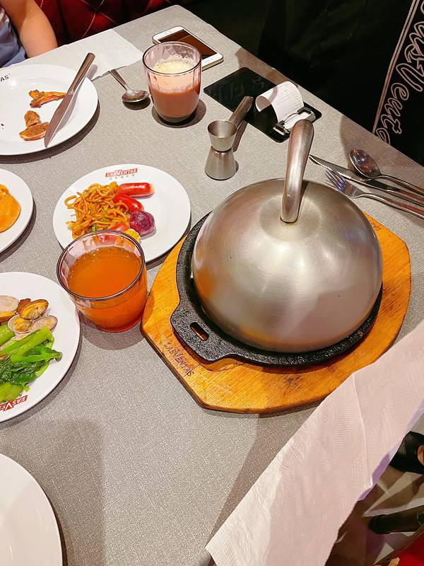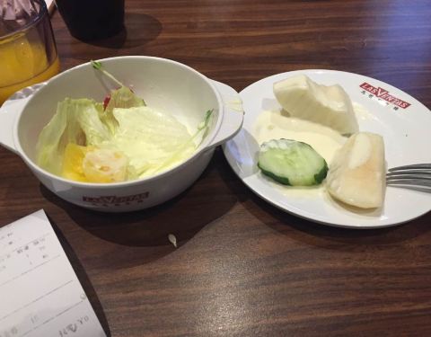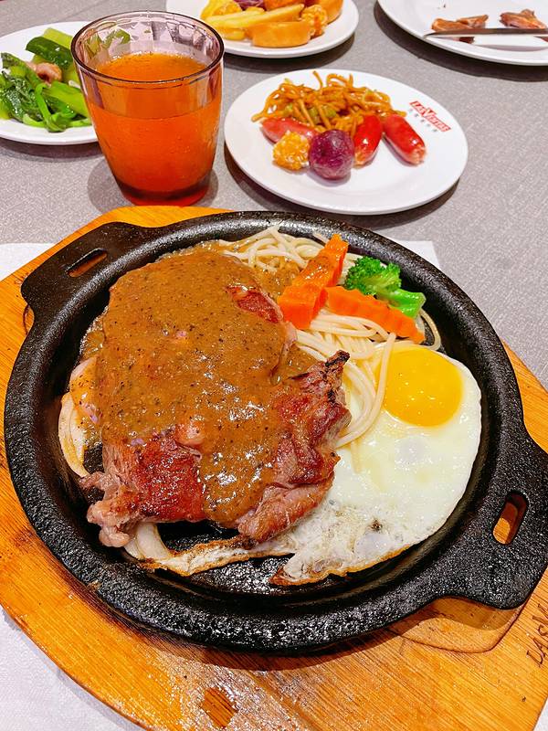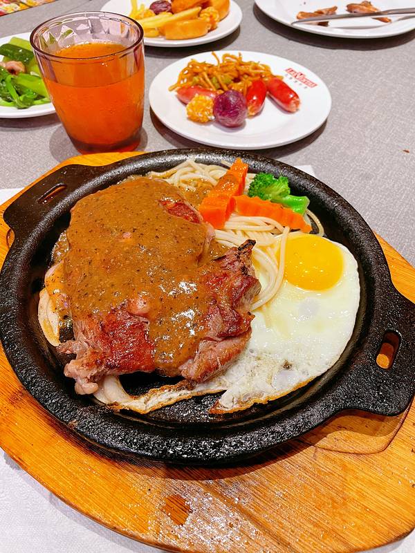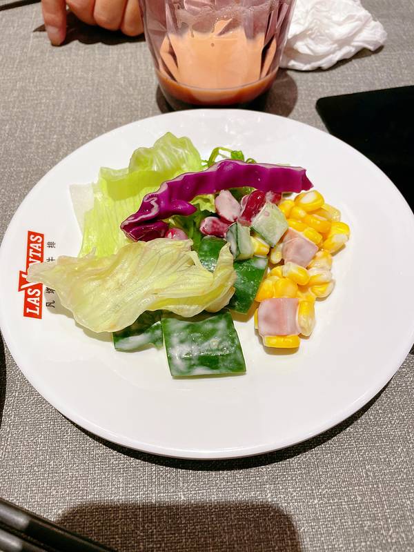 菜单上点了凡塔斯招牌沙朗牛排和欧式芥香火焰牛排,要的都是7分熟,它们家除了单点牛排外,店里自助区设立了免费自助台,等牛排时可以去取食。