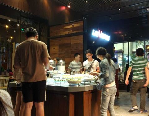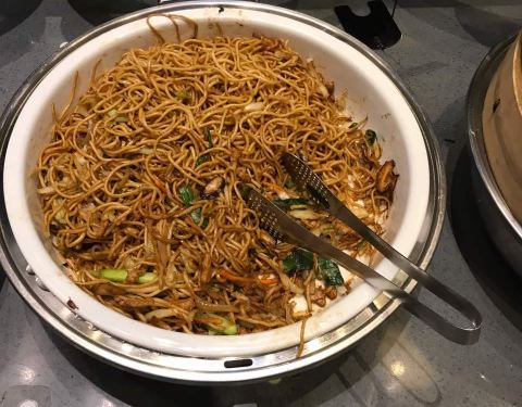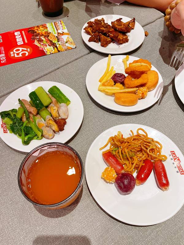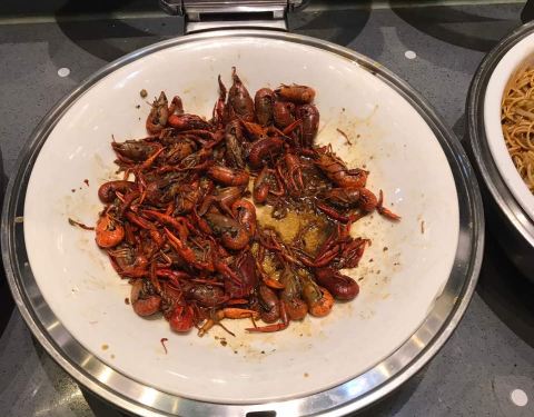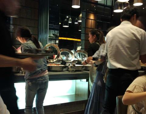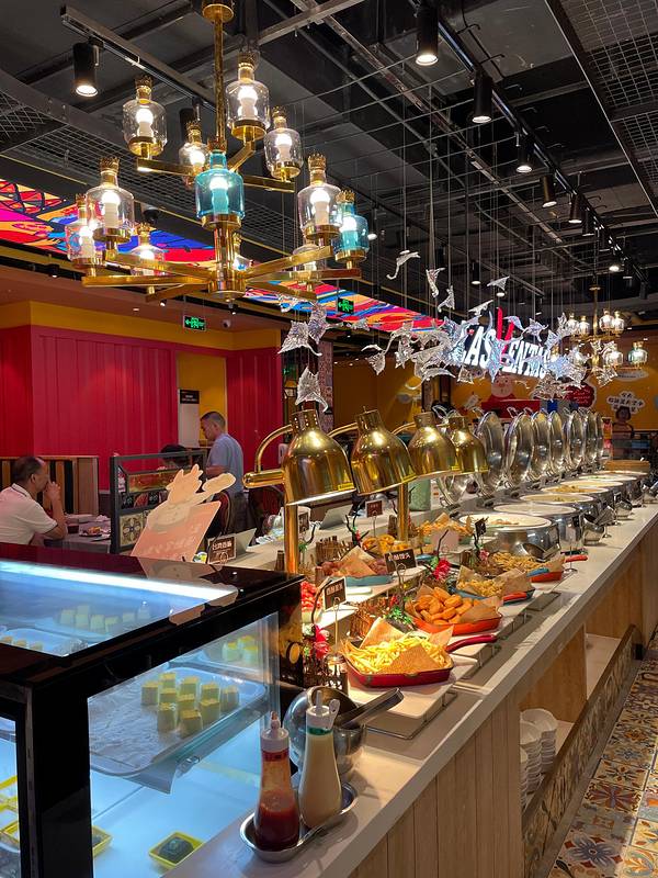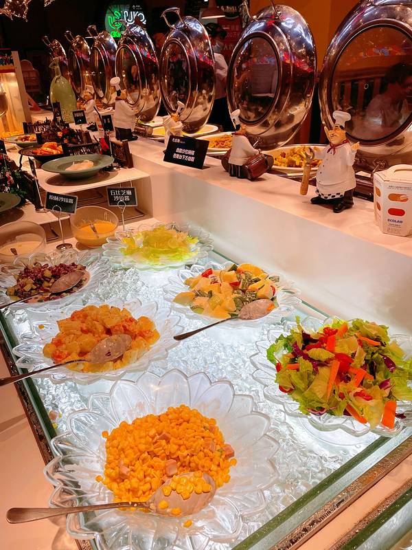自助区大概分炸品类,熟食类,沙拉类,水果类,主食米饭炒面骨汤配菜,各种口味的布丁和小糕点,以及咖啡奶茶冷饮。