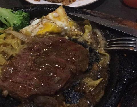 今天周末,人很多,等了好久,吃自助吃到吃不下了才上的牛排,火焰牛排很薄但是口感还可以
