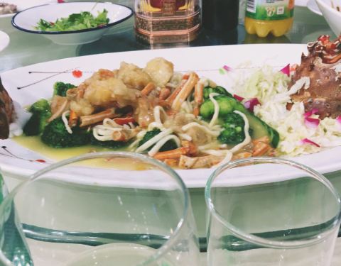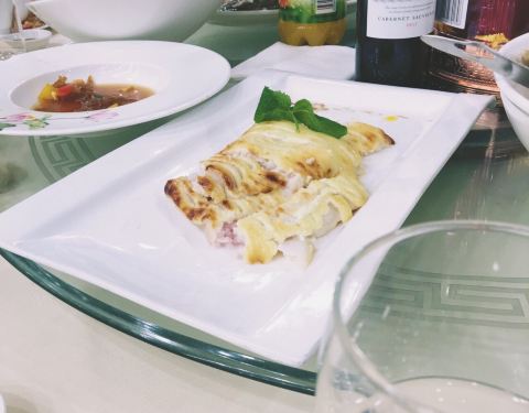 在天鹅湖大酒店吃的婚宴,感觉菜式很新颖,有几道是从来没有在别的婚宴上吃到的。有一盘是烤的三文鱼上面抹了芝士,甜甜的,像是西餐,芝士里面有少许的芥末,还是很好吃的。有一盘是红烧牛蹄筋,很Q很入味。最近婚宴上的海鲜粉丝扇贝系列已经被澳洲龙虾或者是螃蟹取代了,比扇贝粉丝吃的过瘾。