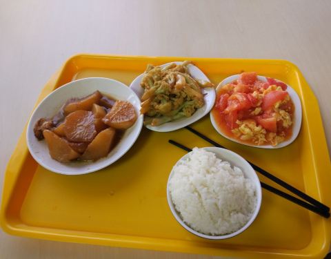 素菜三个,萝卜甜甜的很好吃,花菜也符合自己要的味道,西红柿炒蛋还好,口味看来都不错,物美价廉,餐厅环境也还可以。汤一大碗好像也就六块。荤菜大多标价12元,素菜标价6元左右,不错,推荐。